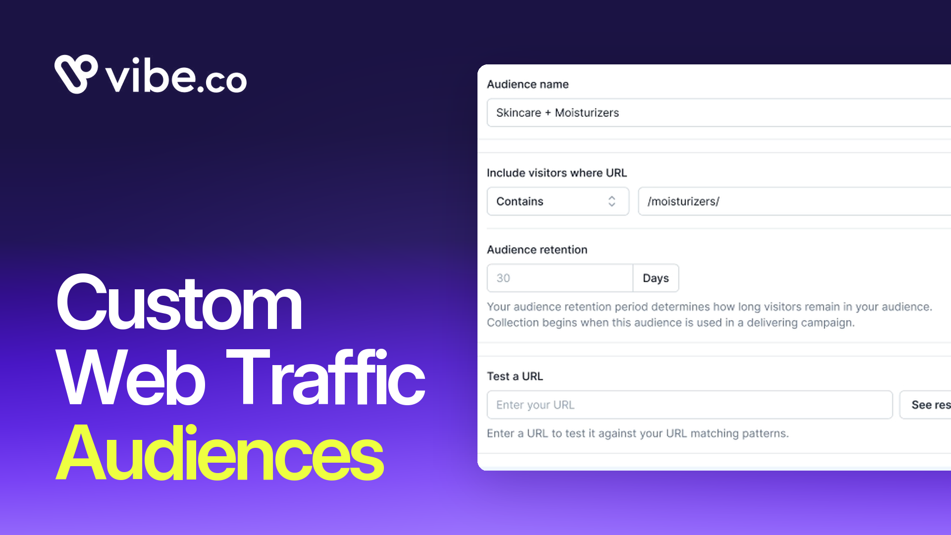 Custom Web Traffic Audiences is live today for all Vibe accounts. You can now build CTV retargeting audiences around specific URL patterns, with 8 matching operators and retention windows of 7, 14, 30, 40, 60, or 90 days.