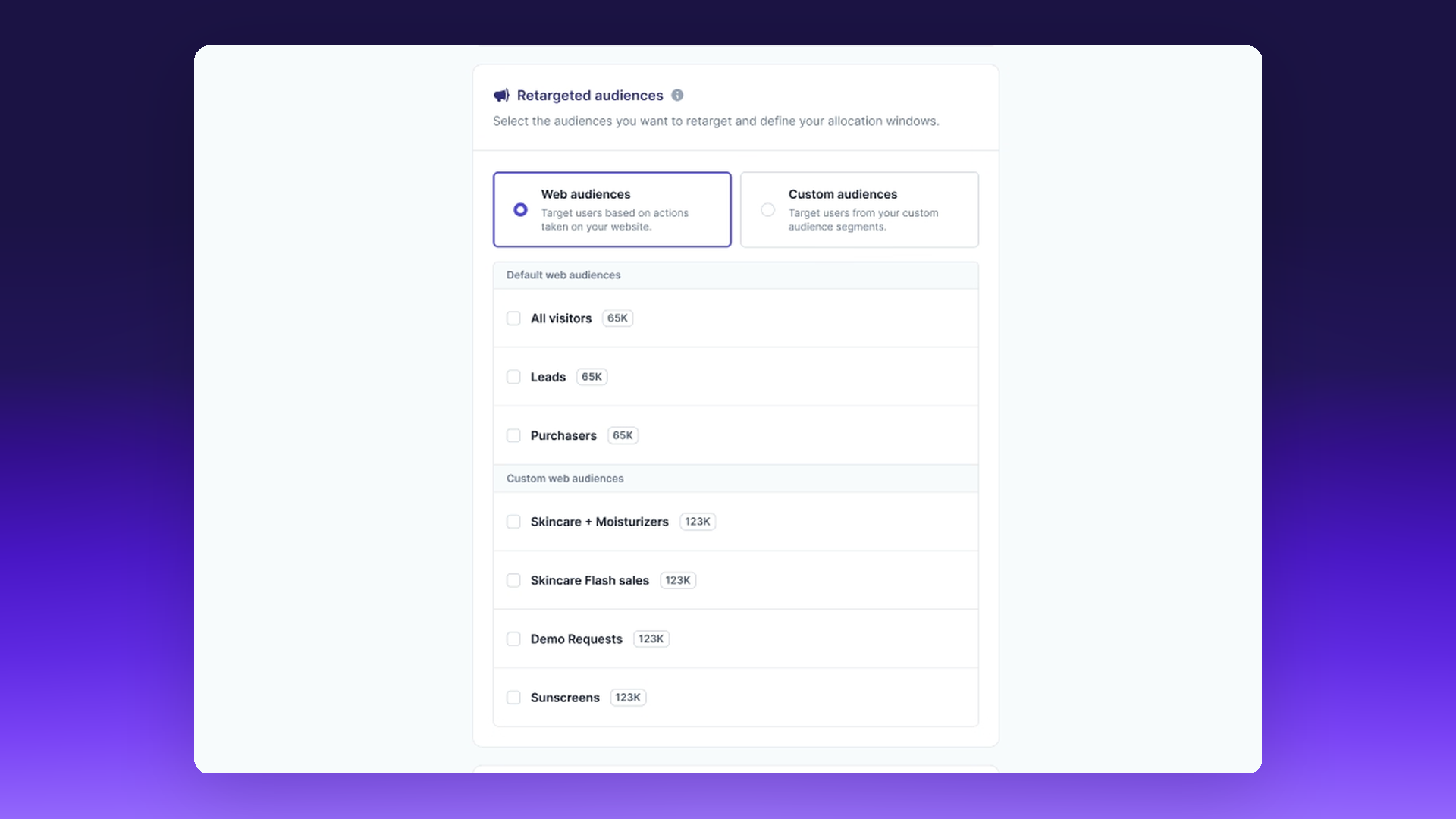 Custom Web Traffic Audiences replaces that with something you can actually operate. Build the audience that matches the intent you want to reach. Set the window that matches the cycle you're in. Serve the creative that answers what the visitor came looking for. Measure the lift on that exact segment instead of the whole pixel.