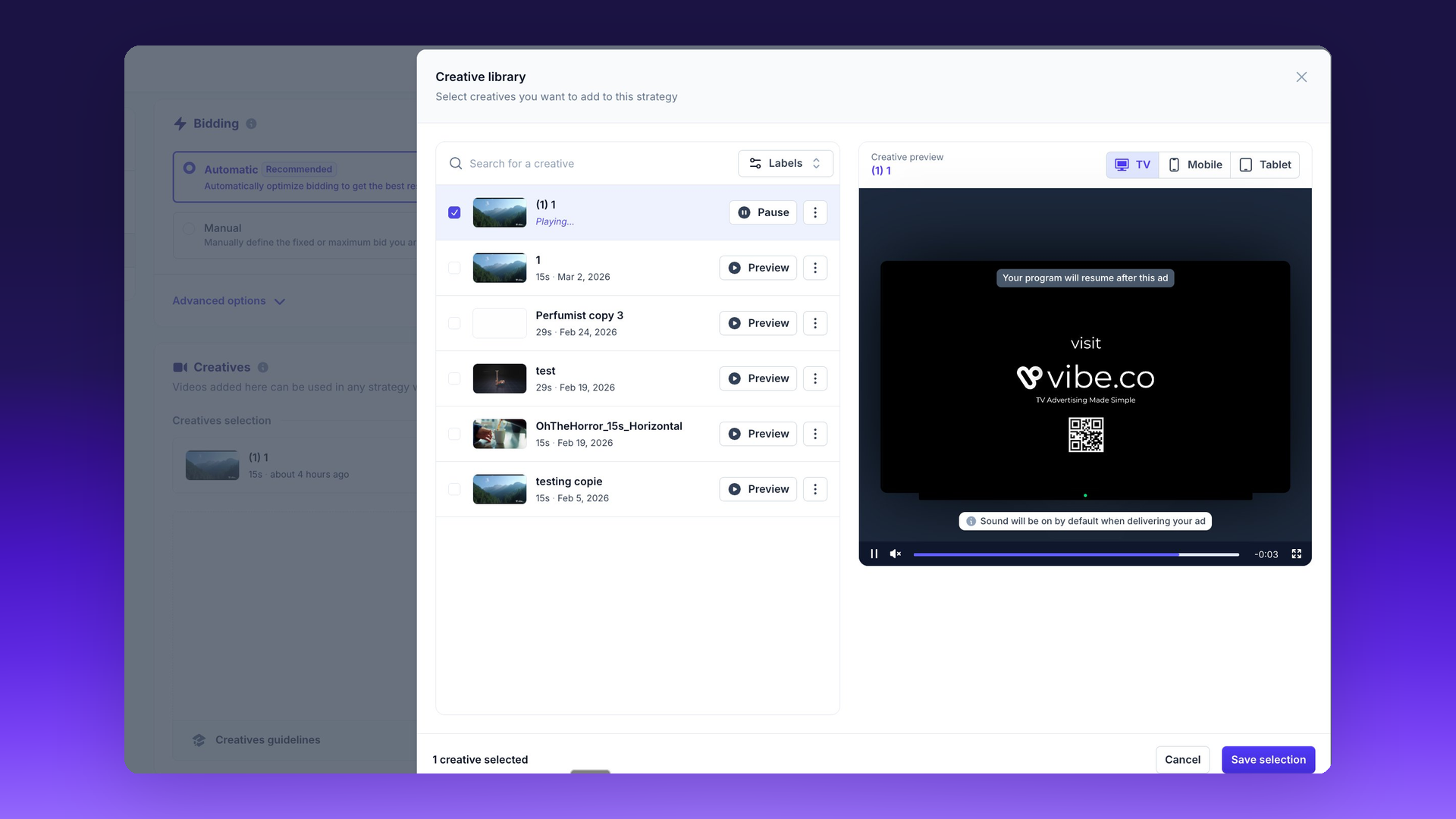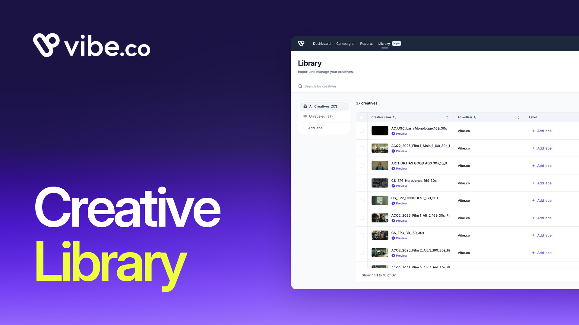 The Creative Library is now complete. Starting today, every creative asset you run through Vibe lives in a single, organized, searchable library, with bulk upload, custom labels, and a fully redesigned in-campaign creative selector.