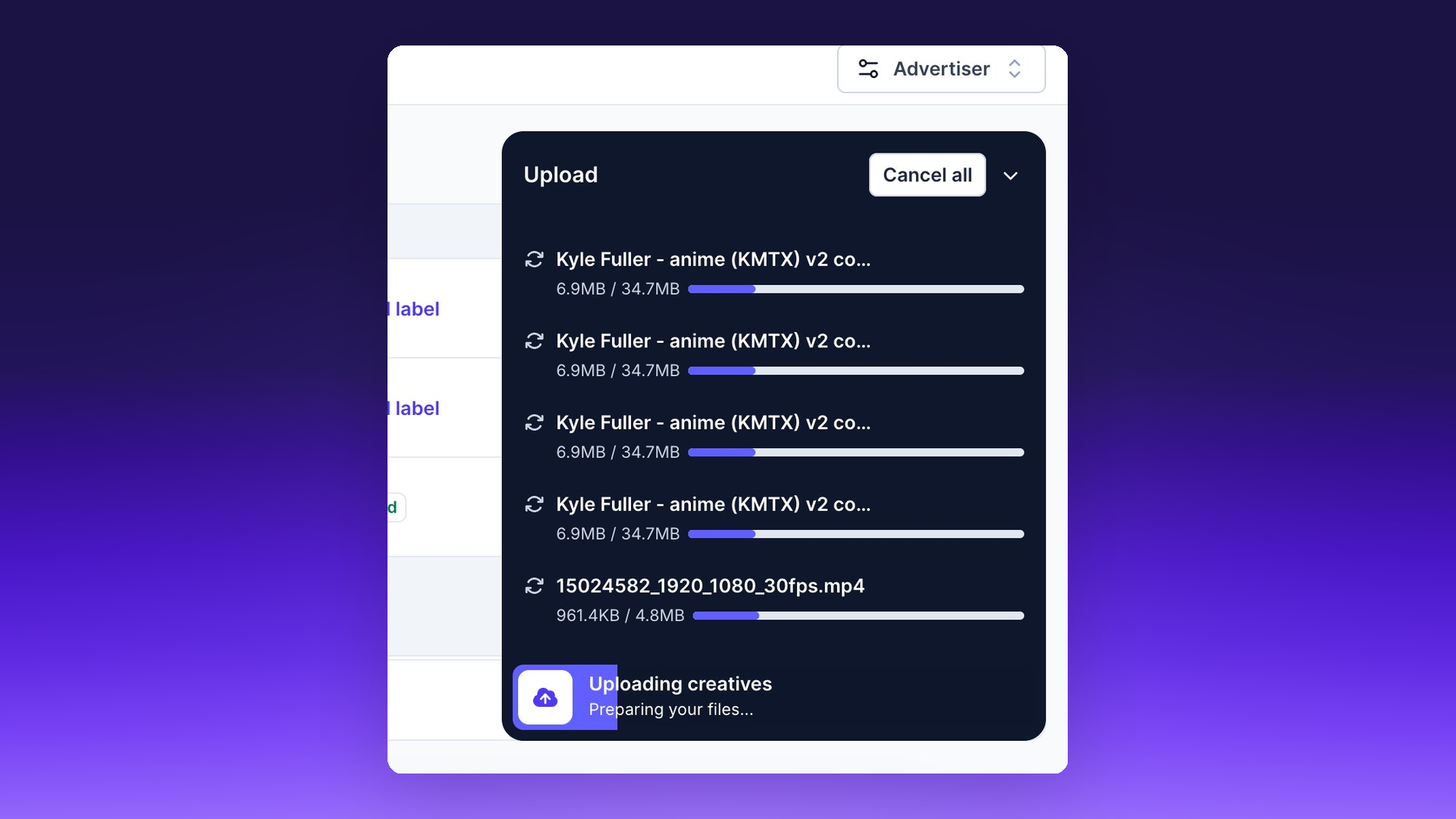 You can upload a full batch of seasonal creatives, label them by brand or campaign type, and go from "files on my desktop" to "live in a campaign" in a handful of clicks. No more hunting for filenames. No more uploading the same asset three different ways.