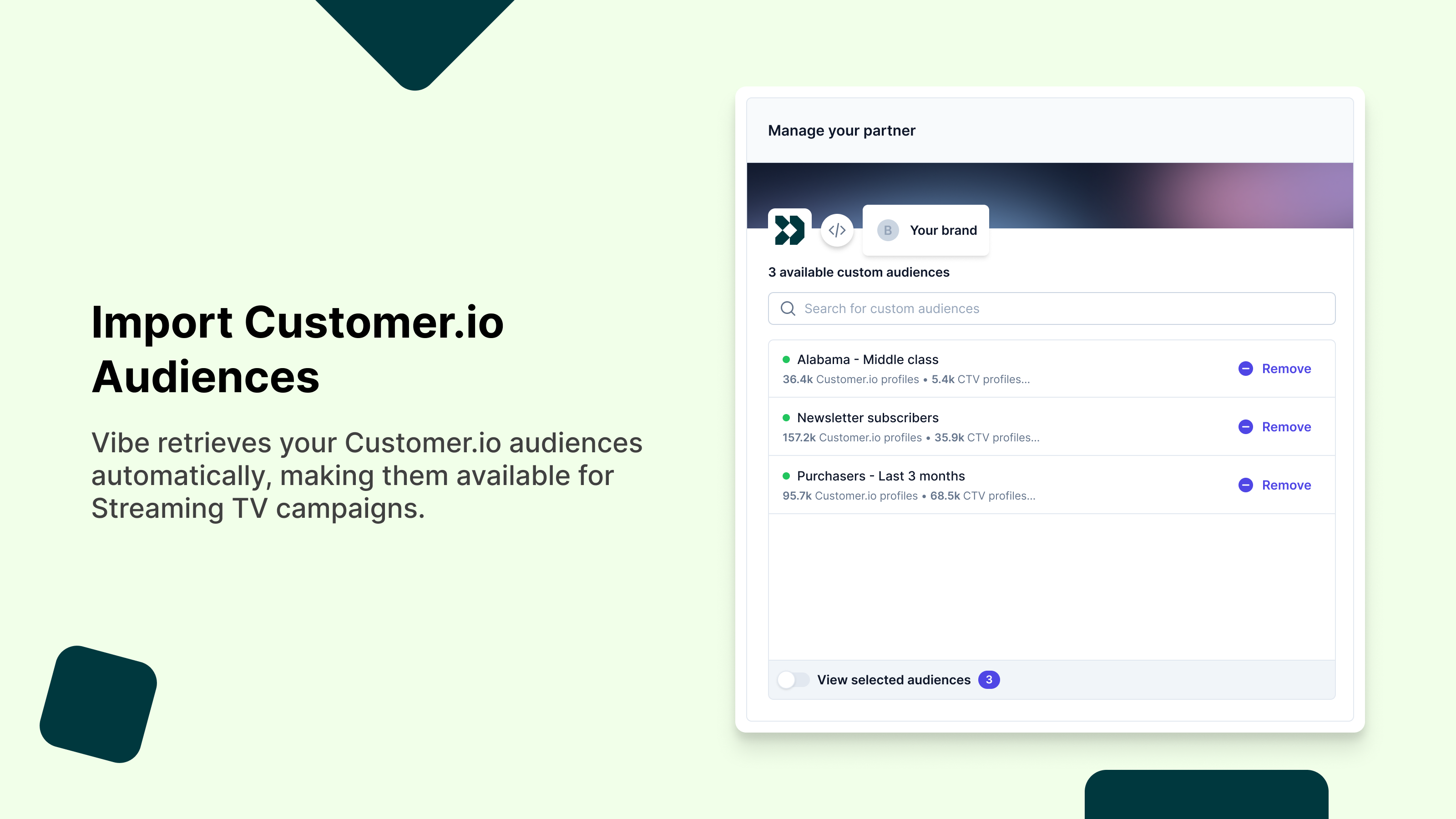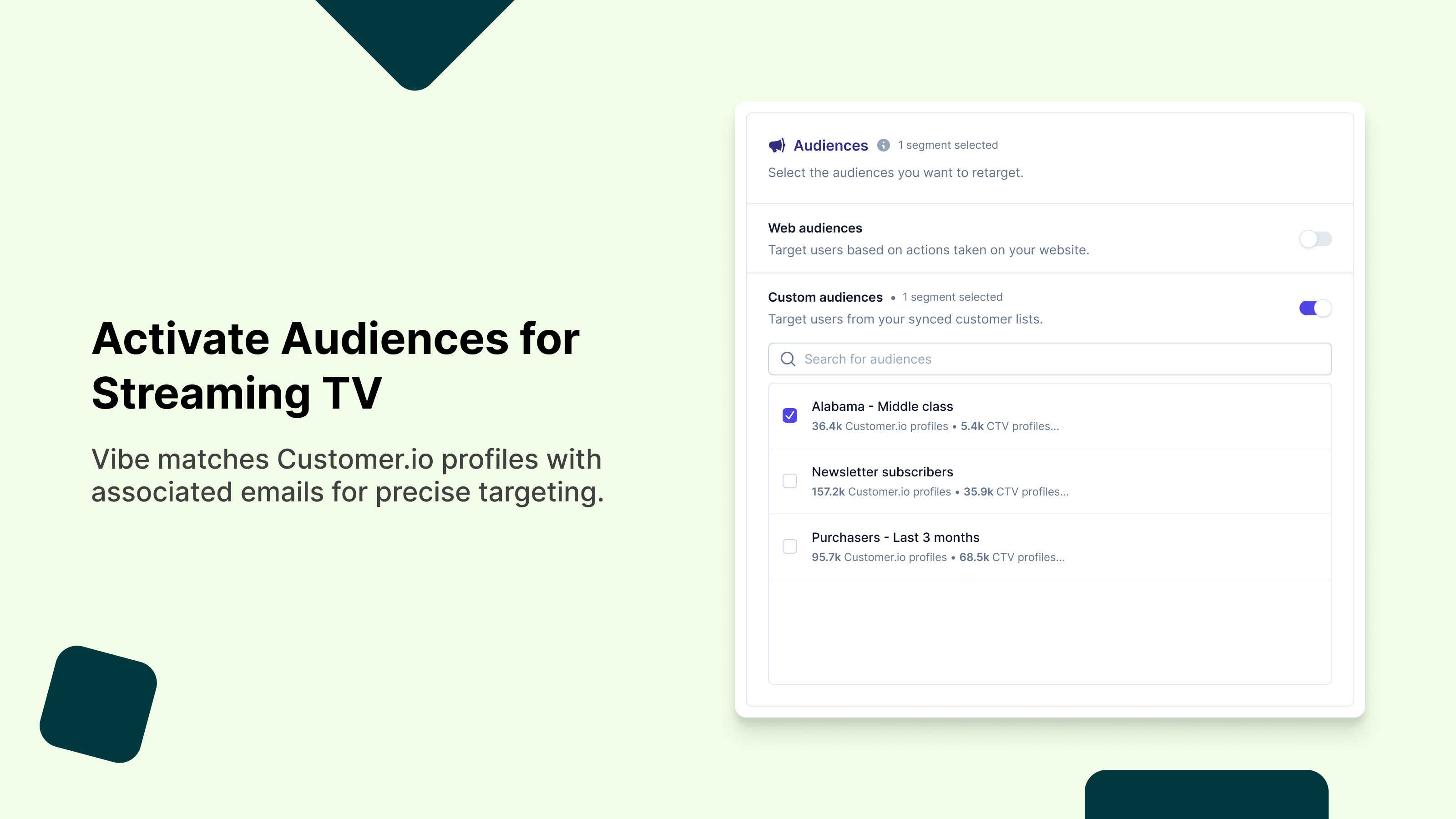 Connect Customer.io to Vibe to automatically sync your segments and retarget your customers on Connected TV. Use your existing Customer.io segments, behavioral triggers, and customer profiles to reach the right people with highly relevant ads on the big screen.