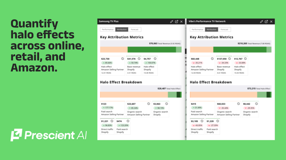 Prescient AI connects your spend and sales data to reveal what truly drives growth. It quantifies halo across retail, Amazon, and online, and shows how awareness converts into measurable sales. Daily and weekly forecasts highlight next-best actions so teams can shift budgets with confidence and see campaign-level performance across all channels, including CTV.