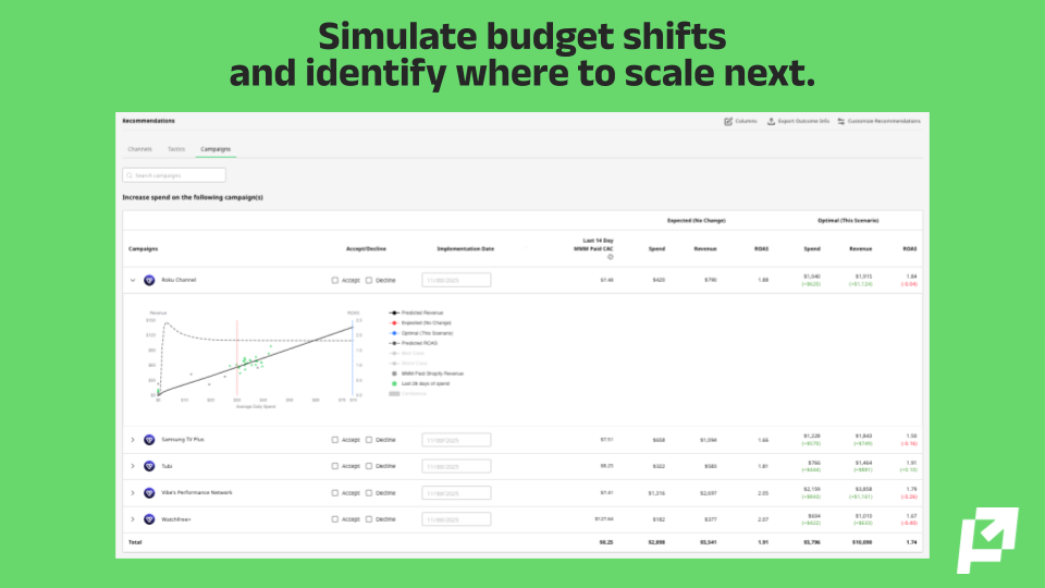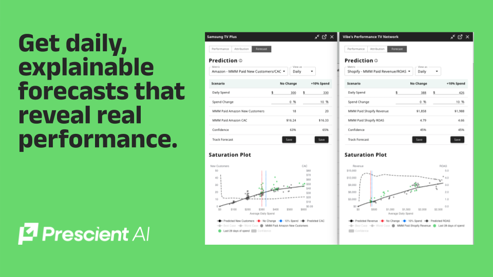 Connect your spend and sales sources, including Shopify, Amazon, or retail feeds. Prescient automatically maps campaigns, quantifies halo, and generates forecasts with confidence ranges. Use what-if simulations to test budget changes, validate results, and identify where to scale. Add CTV campaigns to see cross-channel lift and performance across your marketing mix.